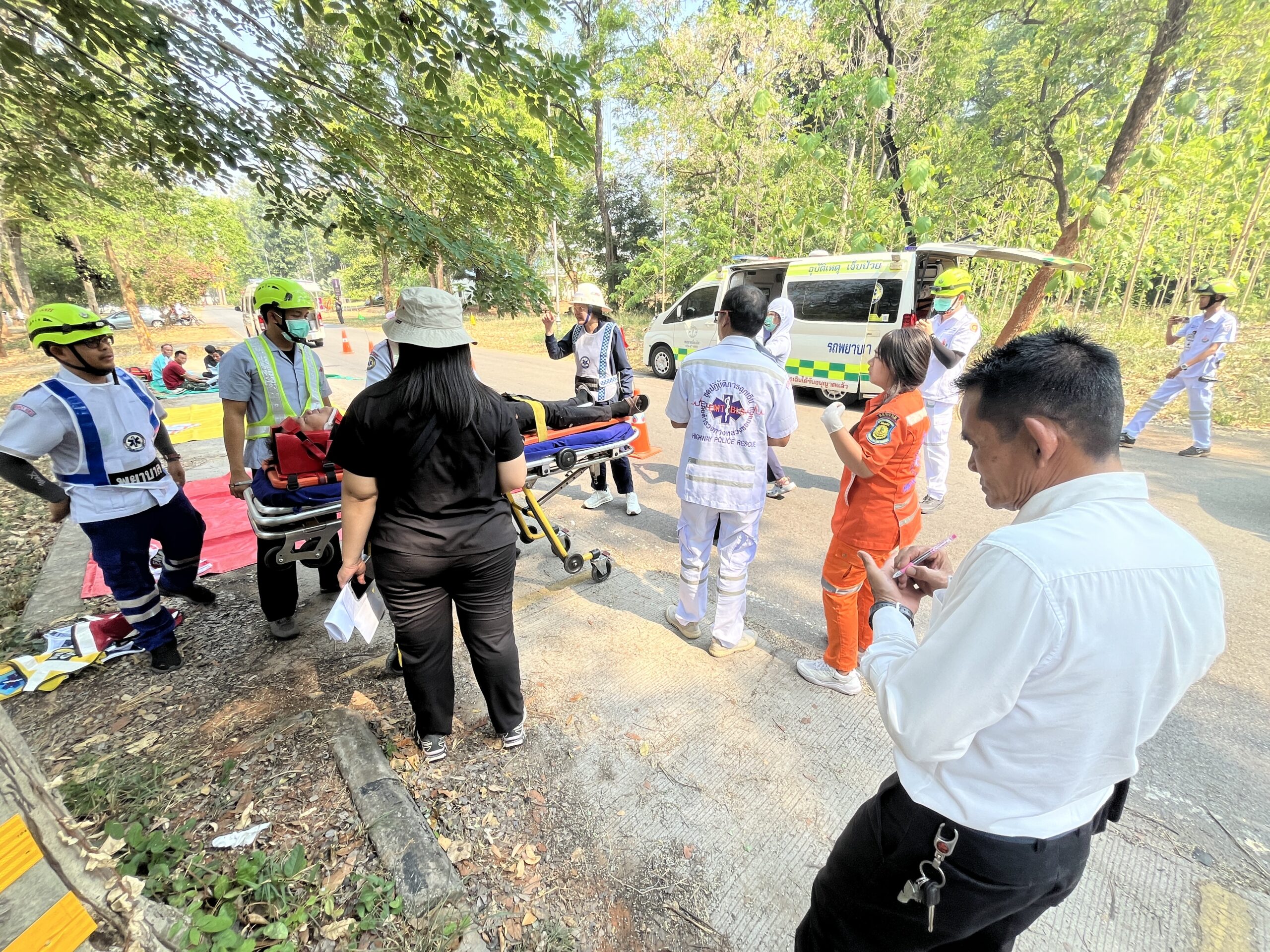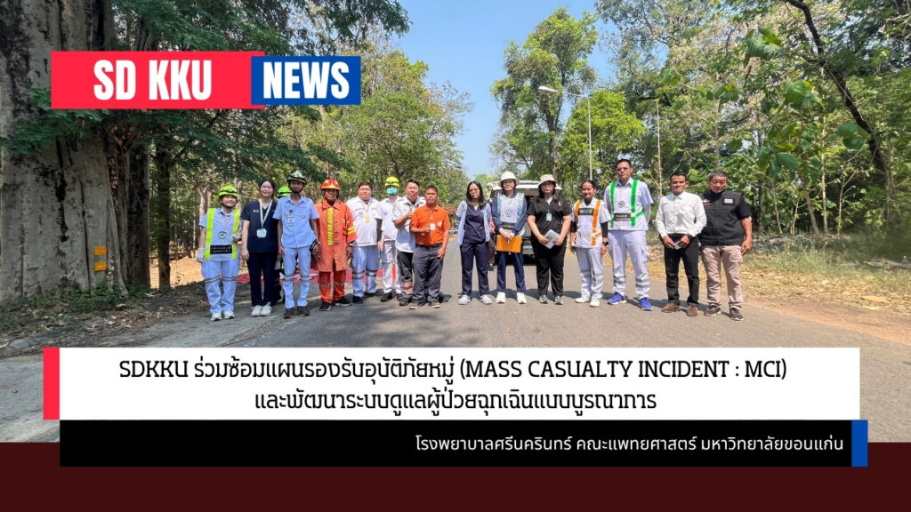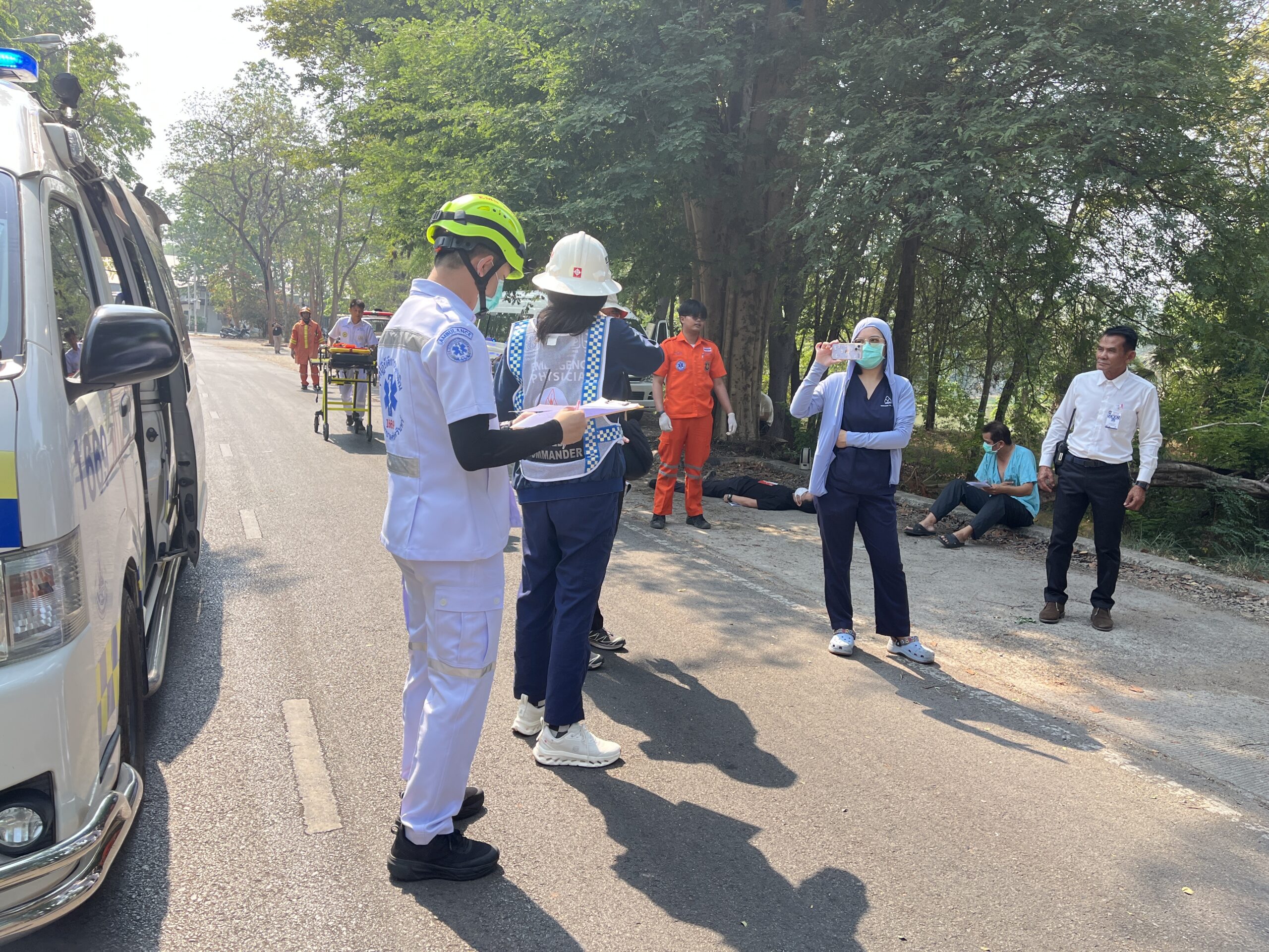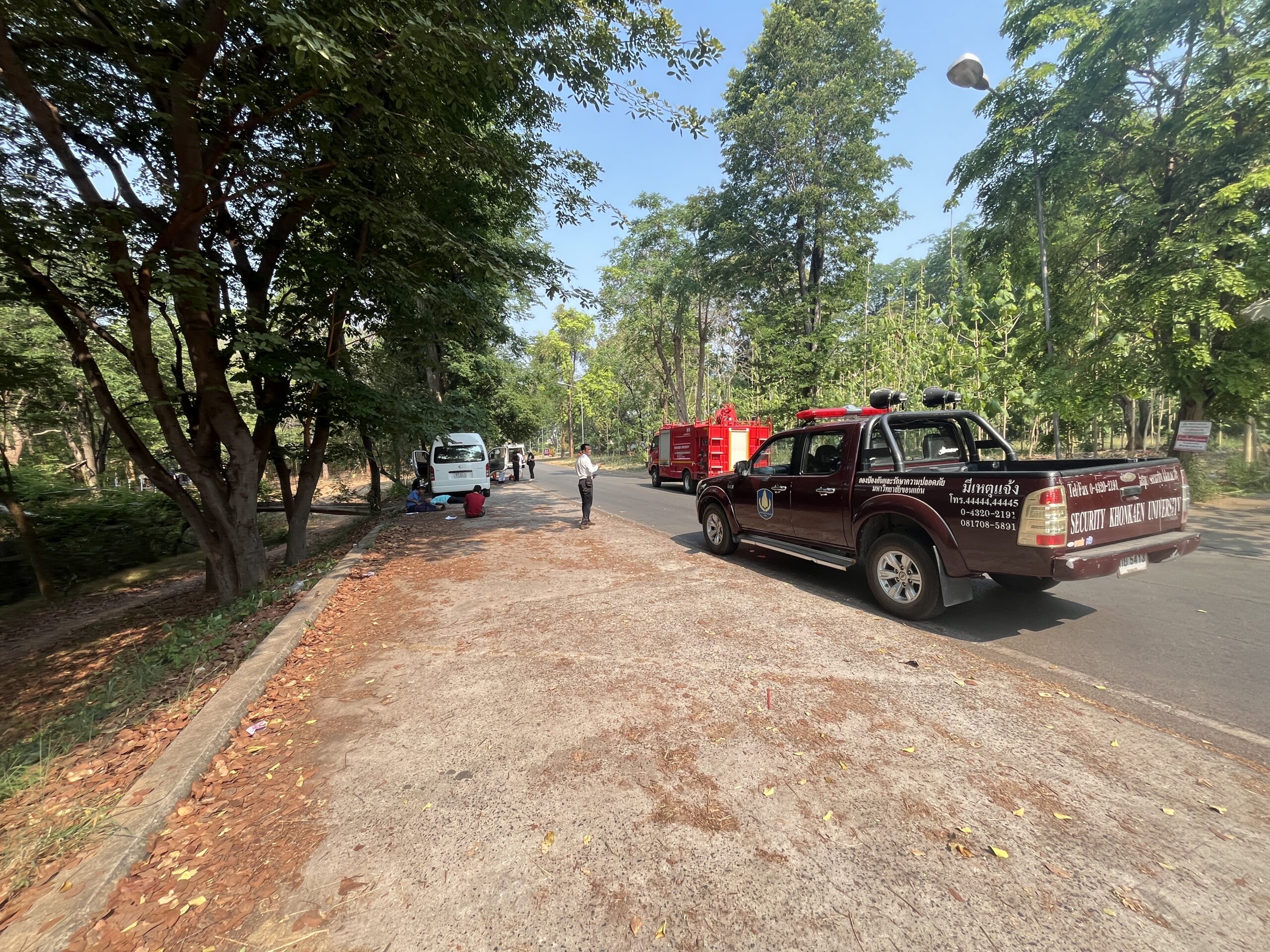 วันพฤหัสบดีที่ 2 เมษายน 2569 เวลา 10.00 น.-12.00 น. กองป้องกันและรักษาความปลอดภัย มหาวิทยาลัยขอนแก่น ร่วมฝึกซ้อมอุบัติเหตุหมู่ (ฝูงชน) ร่วมส่วนงานโรงพยาบาลศรีนครินทร์ บริเวณหน้า FM103 มหาวิทยาลัยขอนแก่น เป็นเหตุรถตู้ชนต้นไม้ มีผู้บาดเจ็บทั้งหมด 10 ราย เคสแดง 2 ราย เคสเหลือง 2 ราย และเคสเขียว 6 ราย มีหน่วยงานเข้าร่วมจากกู้ชีพเทศบาลเมืองศิลา กู้ชีพเทศบาลตำบลสำราญ และกู้ภัยทางหลวง