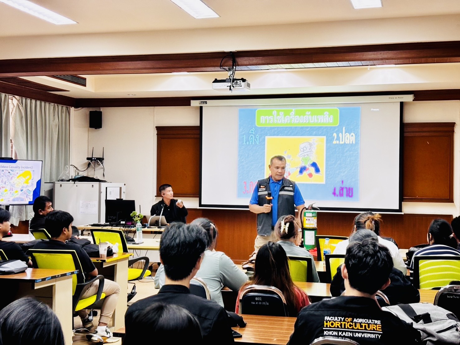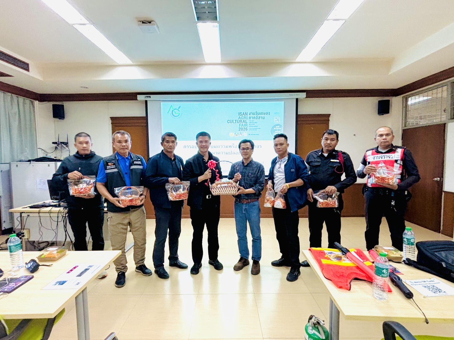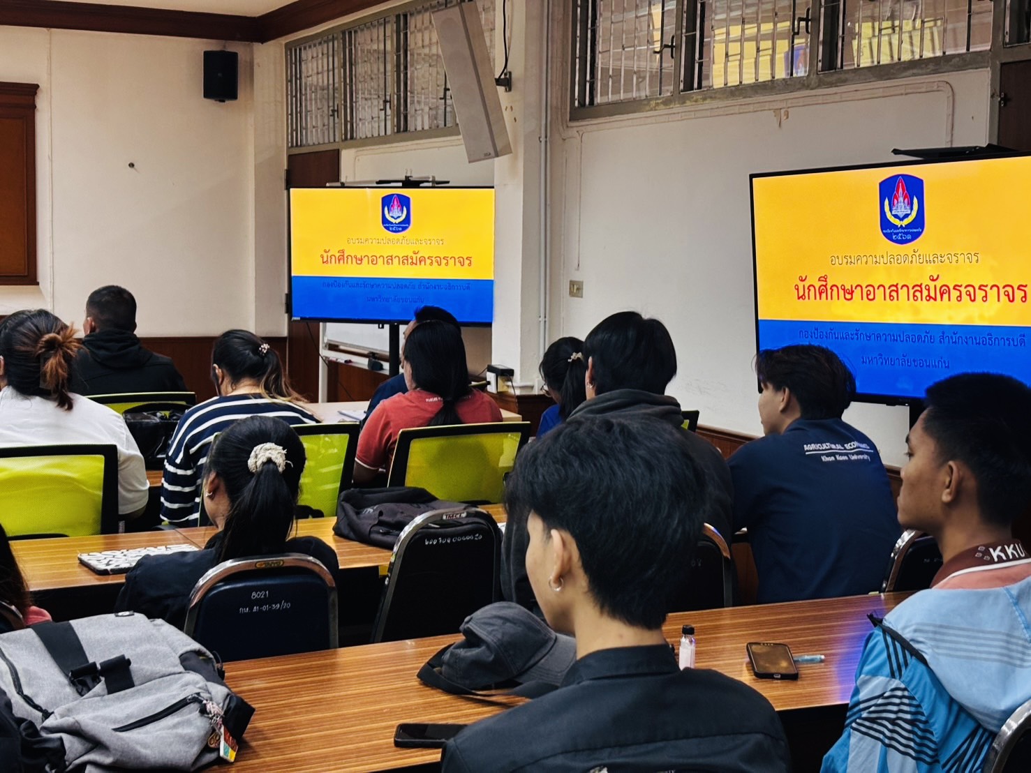 เมื่อวันจันทร์ที่ 19 มกราคม 2569 เวลา 08.30 – 12.00 น. กองป้องกันและรักษาความปลอดภัยมหาวิทยาลัยขอนแก่น นำโดย นายมรกต สุบิน ผู้อำนวยการกองป้องกันและรักษาความปลอดภัย หัวหน้างานป้องกันและบรรเทาสาธารณภัย หัวหน้างานสืบสวนและการข่าว พร้อมทีมหน่วยควบคุมและสั่งการ หน่วยงานจราจร เป็นวิทยากรให้ความรู้ฝึกอบรมงานจราจรและรักษาความปลอดภัยแก่นักศึกษา เพื่อรักษาความปลอดภัยในงานเกษตรภาคอีสาน ประจำปี 2569 จำนวน 50 คน